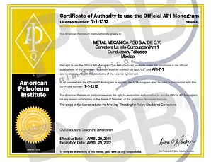 Desde el 2016 somos parte del selecto grupo de empresas del ramo petrolero que cuenta con una certificación internacional en el proceso de roscado de herramienta y tubería de perforación.